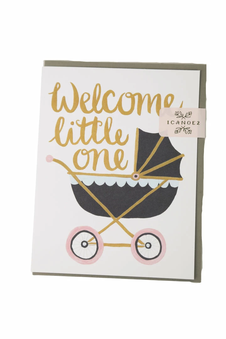 There is nothing like meeting a sweet little baby for the first time and being able to capture you excitement into words. Plus, it is always fun to look back on old cards you got when you were a baby from loved ones. Featuring a lavender back round, old fashion stroller, and gold cursive writing.