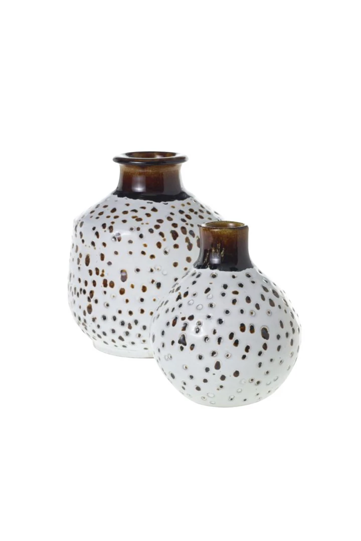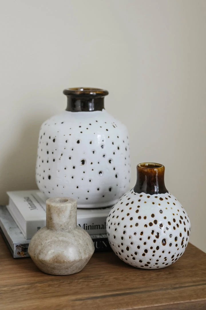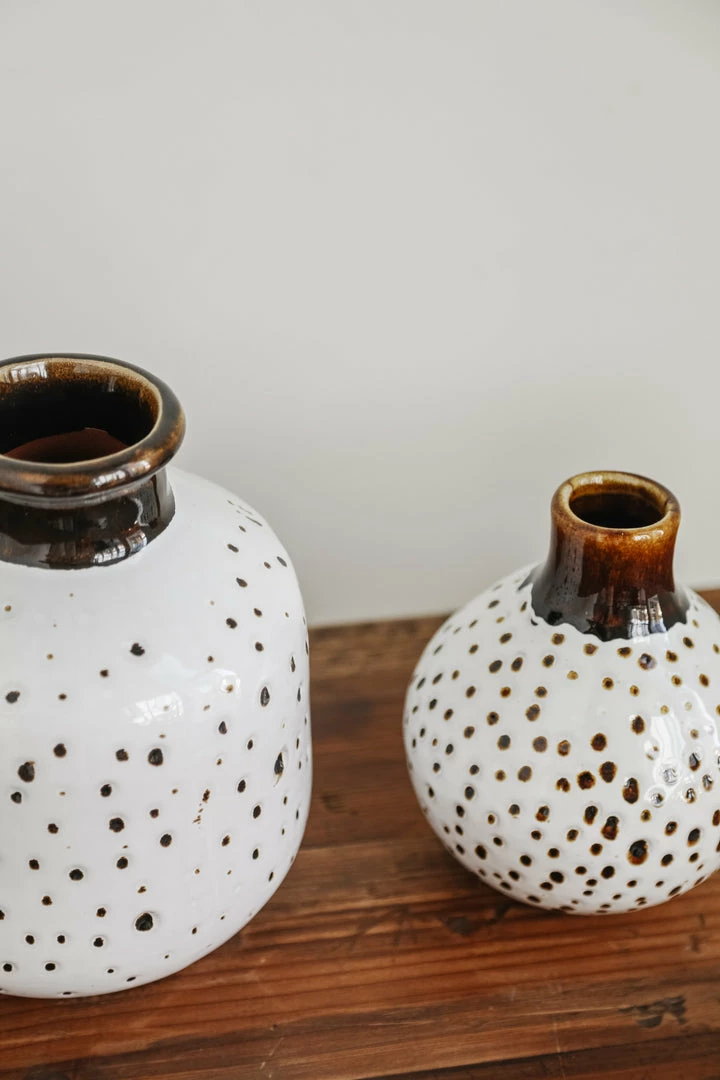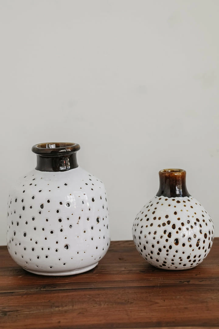 handthrown terracotta, which is then layered with black and white glaze for a rich and unique look