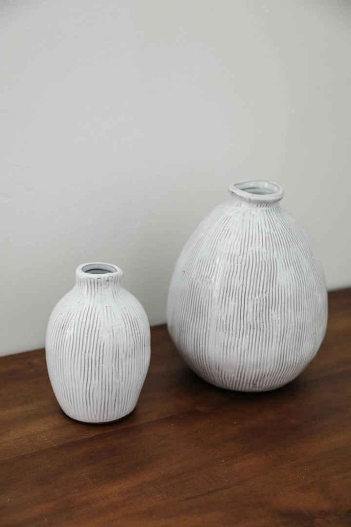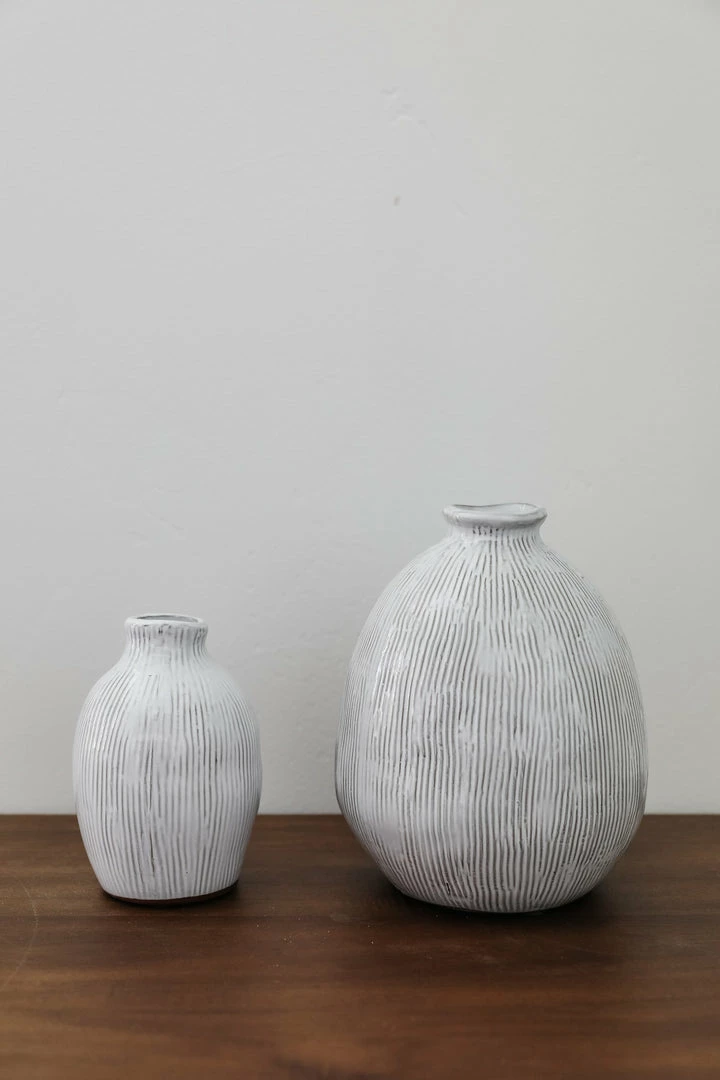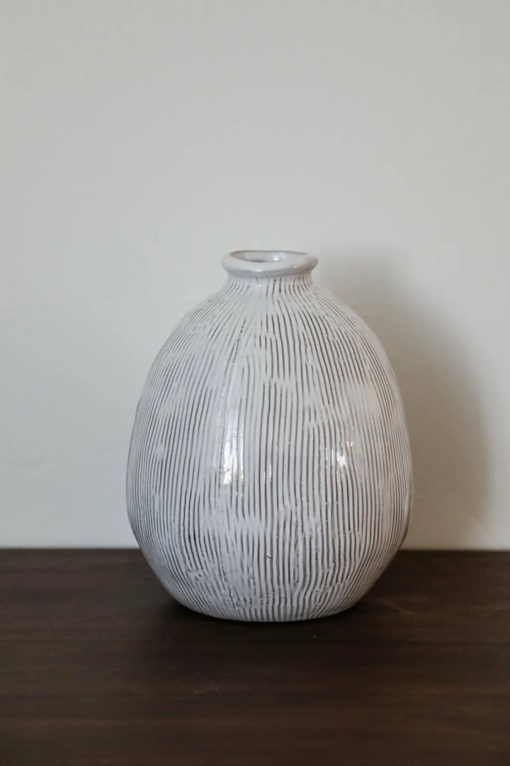 3-1/2″ Round x 5-1/4″H Terra-cotta Vase w/ Engraved Lines, White