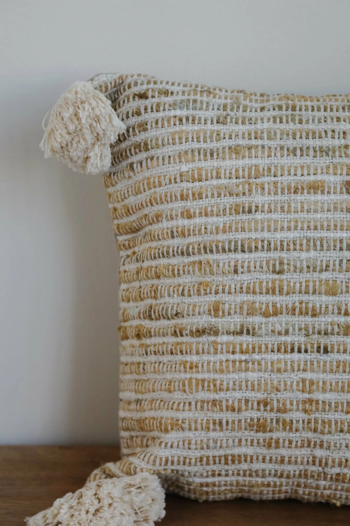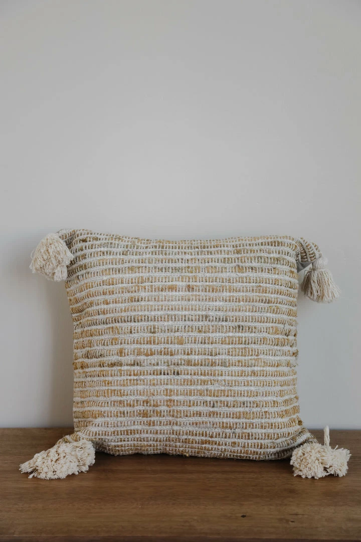 20″ Square Woven Cotton Striped Pillow w/ Tassels, Cream Color & Natural
