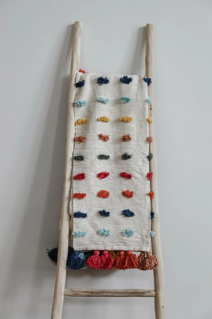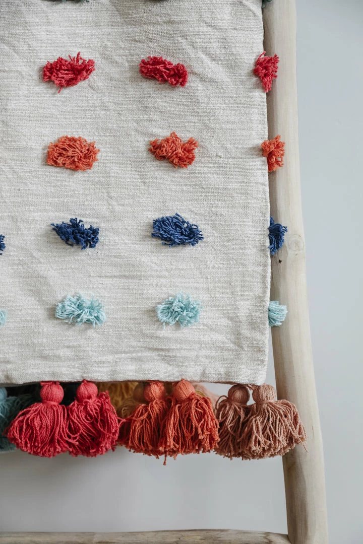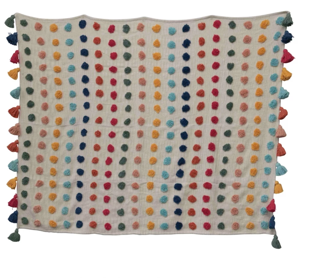 60″L x 50″W Woven Cotton Throw w/ Tufted Dots & Tassels, Multi Color