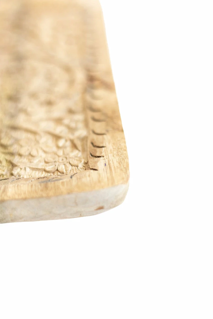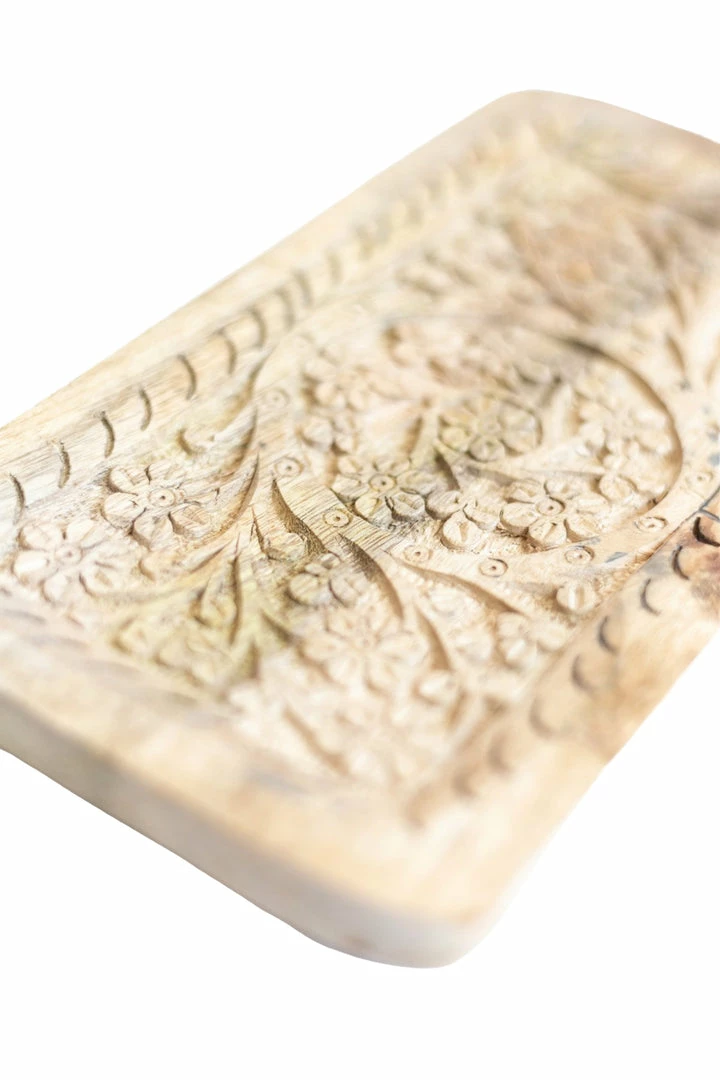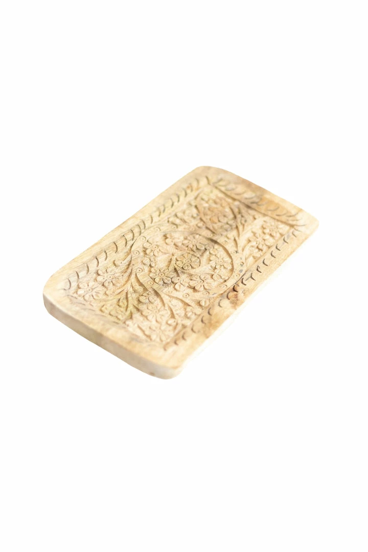 Hand carved mango wood tray that is perfect for storing bar soap in a bathroom, or for displaying trinkets. Due to the nature of this product, individual trays will have slight differences.