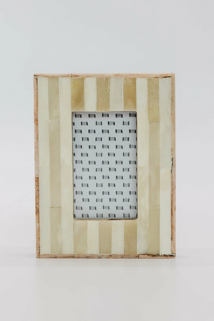This photo frame is perfect for displaying your favorite memories. Handmade, this two toned bone and MDF frame features a natural color that matches with any decor styles. Looks great placed on shelves, side tables and dressers for an easy decoration