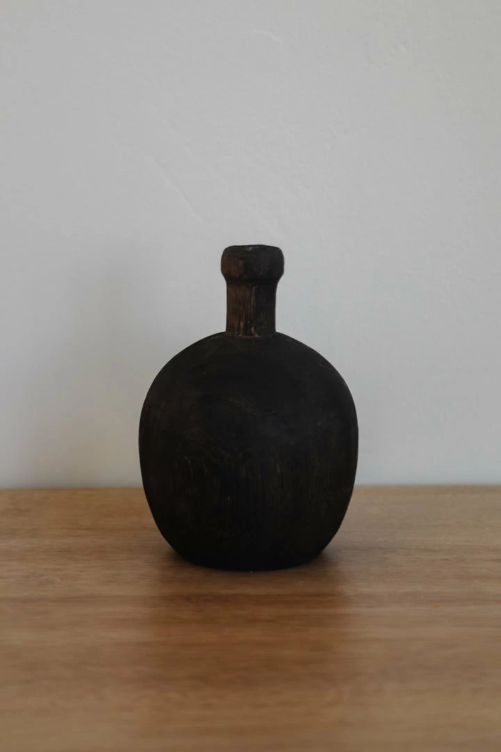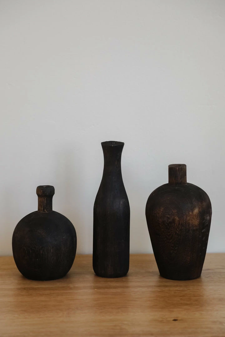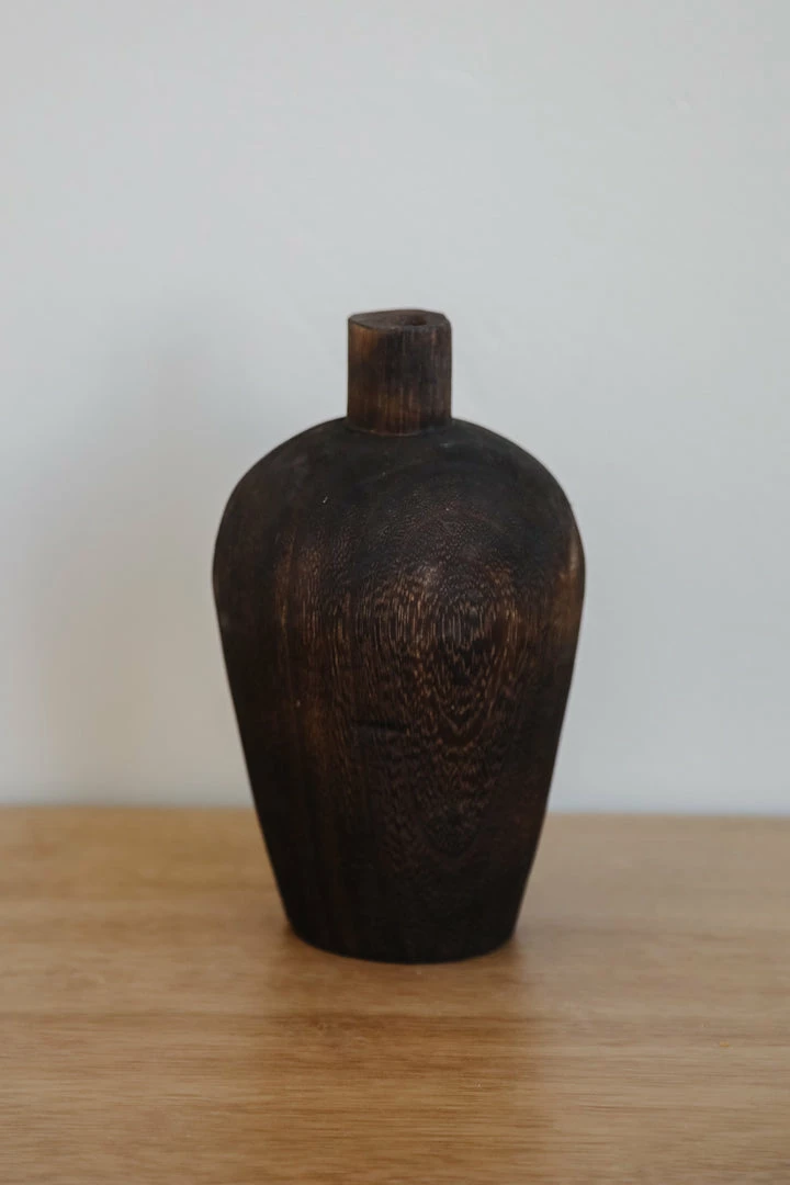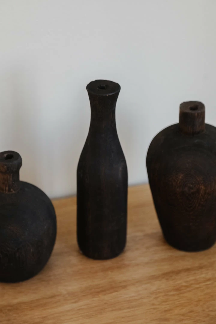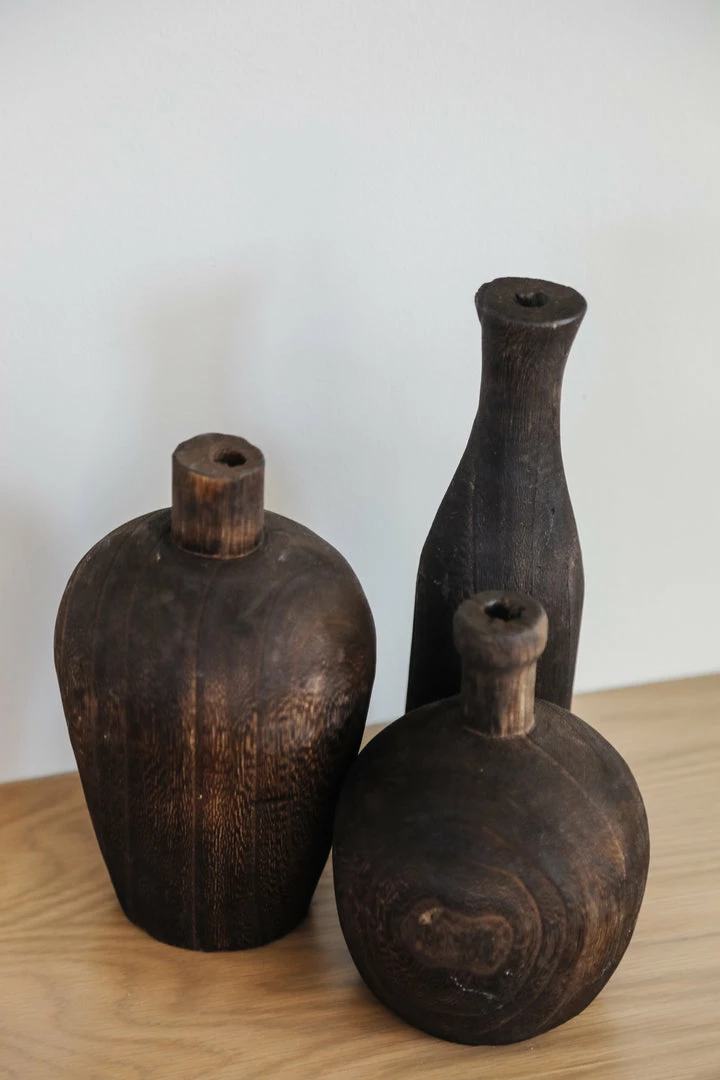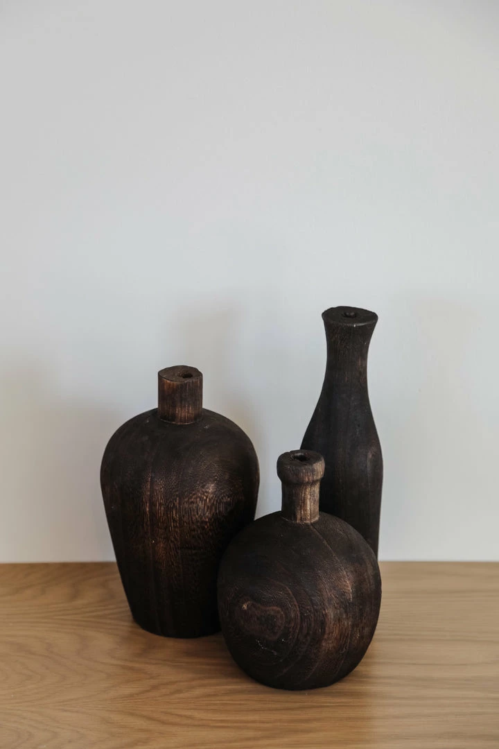 Adorable wooden vases that are perfect for adding some dimension to your bookshelf or side table. Come in 3 different heights, collect all three or use a single. Dark stained wood finish.