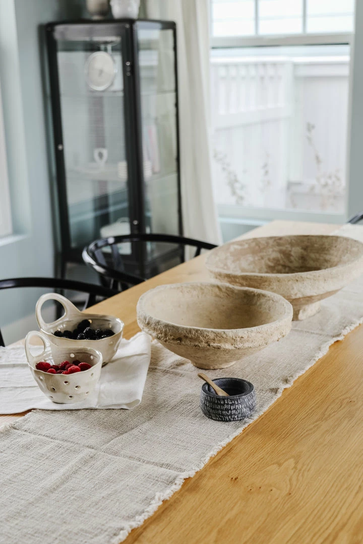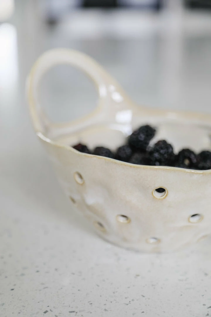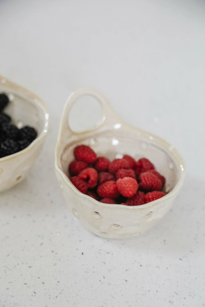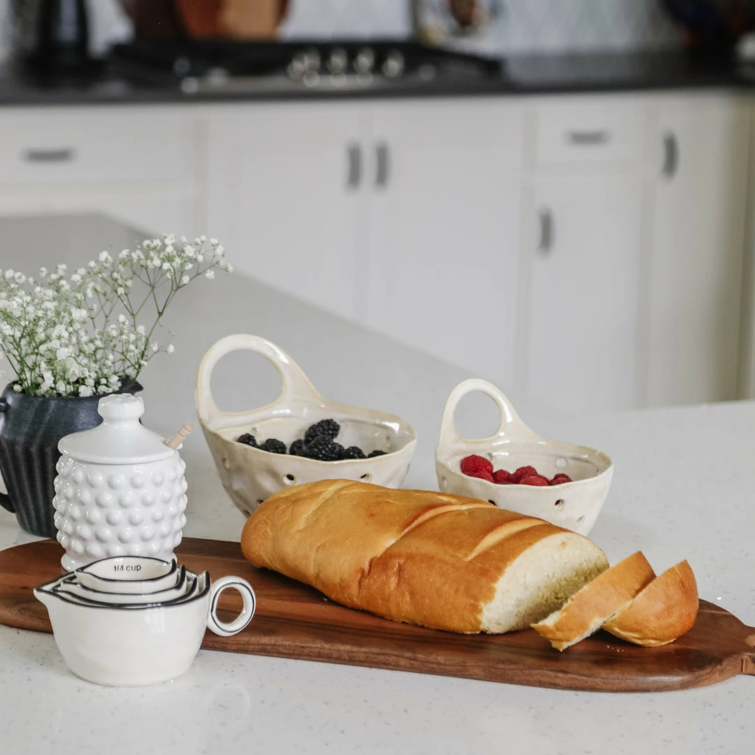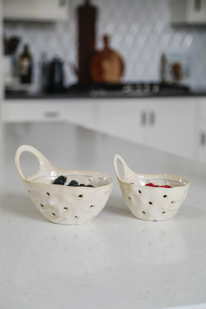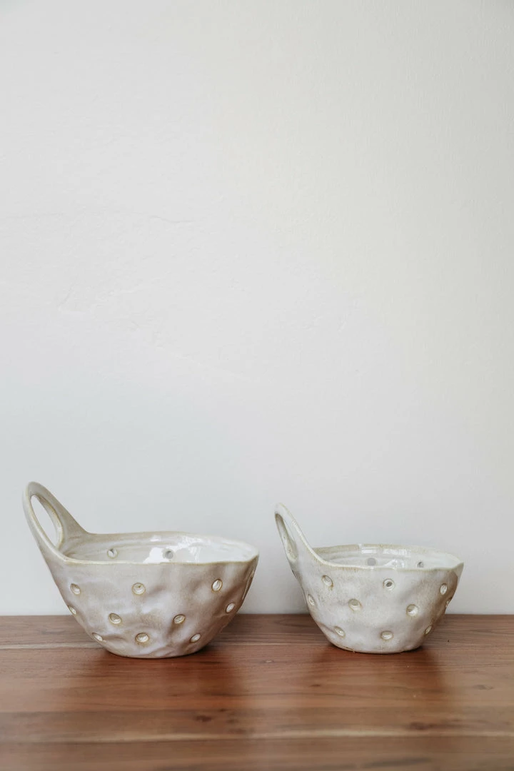 8″L x 6-1/2″W x 5″H & 6-1/2″L x 5-1/2″W x 4-3/4″H Stoneware Colanders w/ Handles, Reactive Glaze, Cream Color