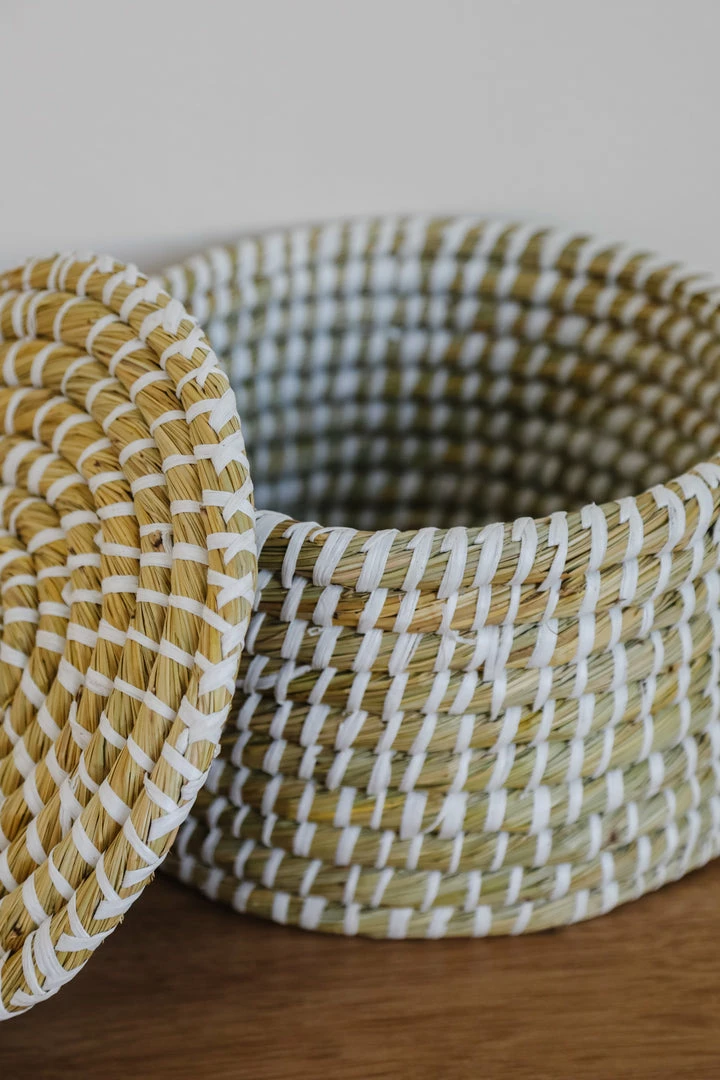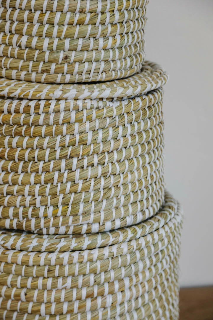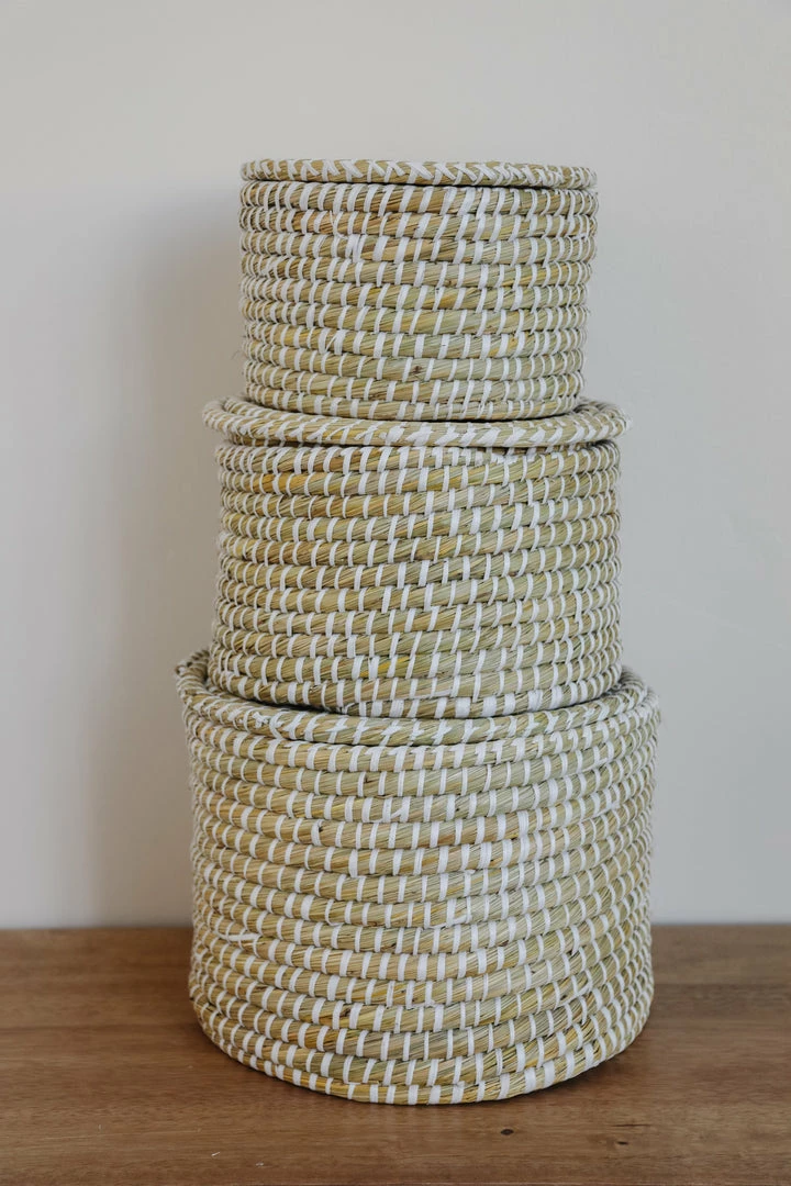13-3/4″ Round x 8-1/2″H, 11-3/4″ Round x 7″H & 9-3/4″ Round x 6″H Natural Woven Seagrass Baskets w/ Lids, Whitewashed