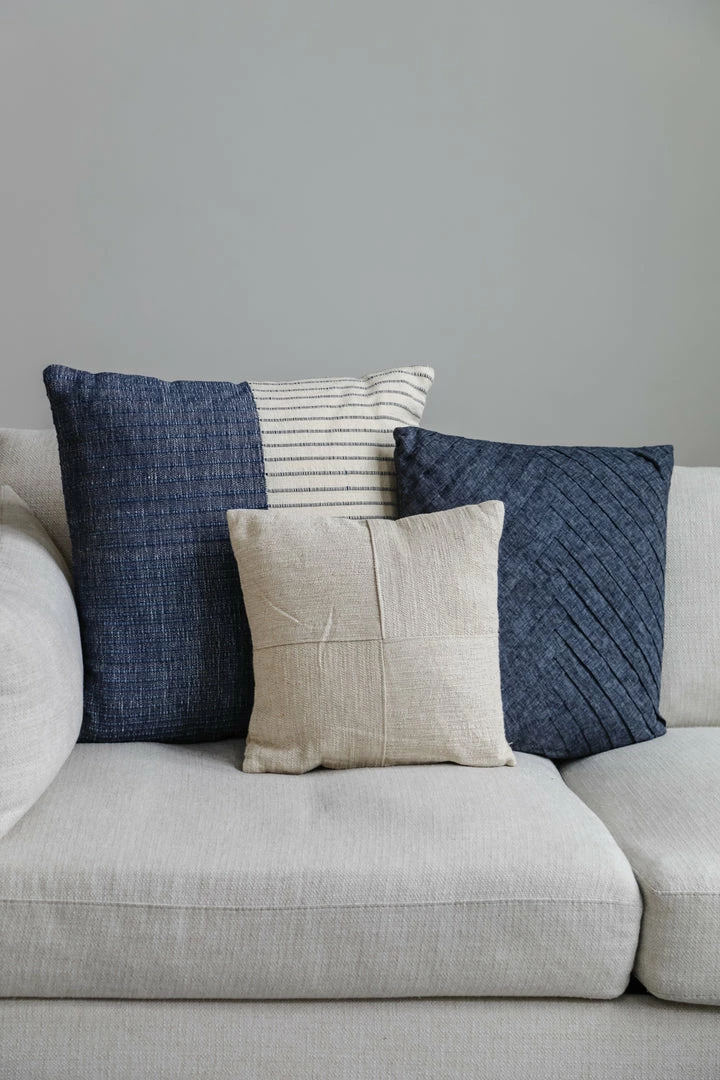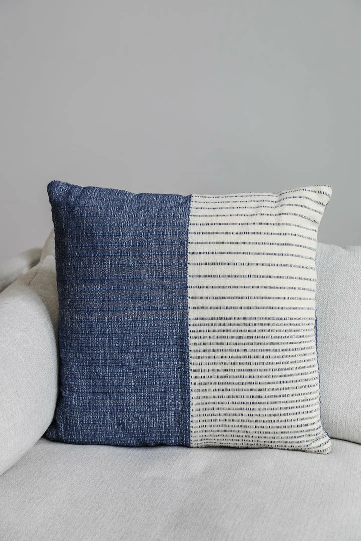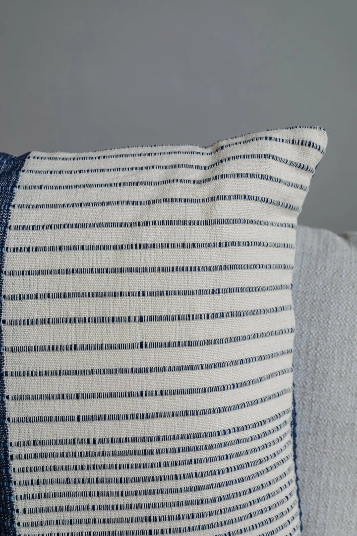 24″ Square Woven Wool & Cotton Pillow w/ Stripes, Blue & White