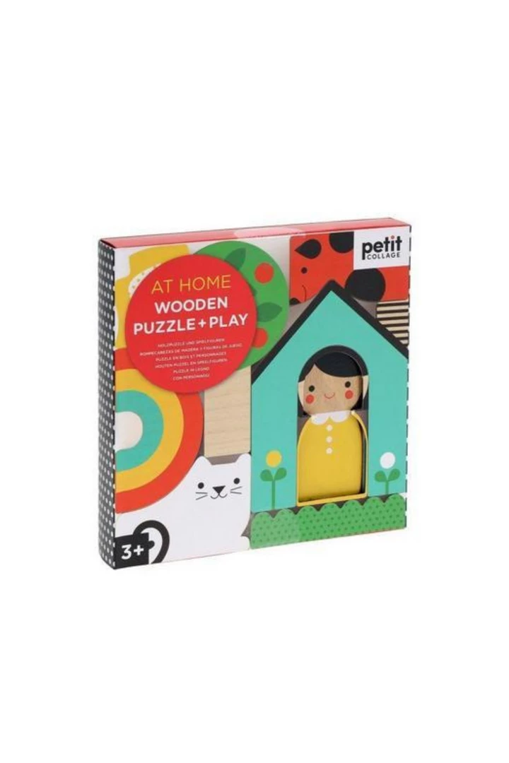 Puzzle, play and display! This mini wooden puzzle is a brainteaser and play set all in one. Create a story with these colorful characters or practice your puzzle solving skills. Includes 8 chunky wooden pieces.