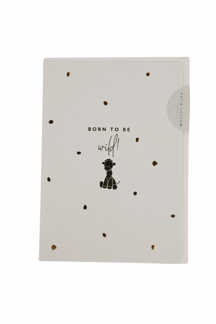 Celebrate the life of a newborn baby with this cute born to be wild card! Featuring a white back round with mirrored gold dots, text, and baby giraffe on the front.