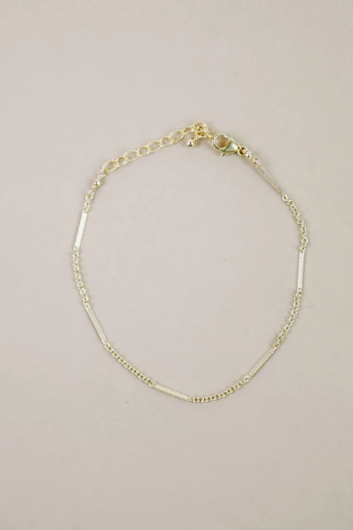 The Peter Gold Bracelet is a delicate gold long bar and chain bracelet.
