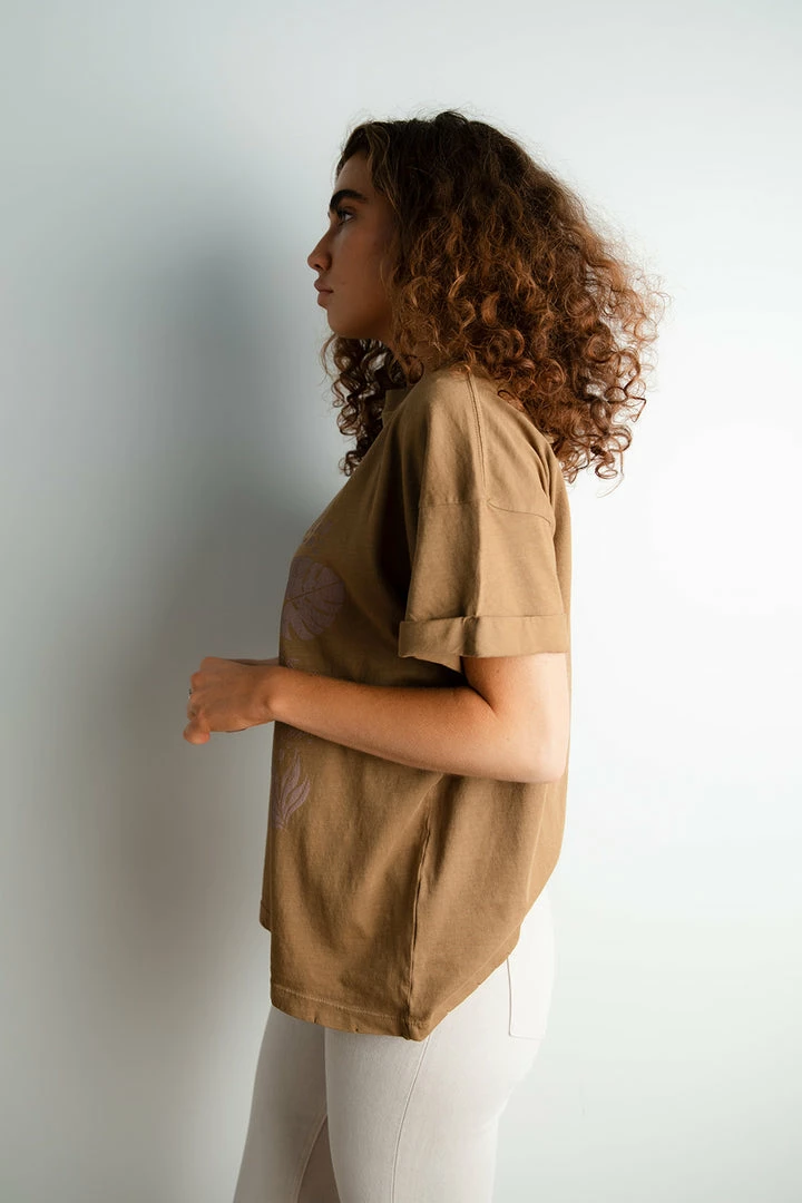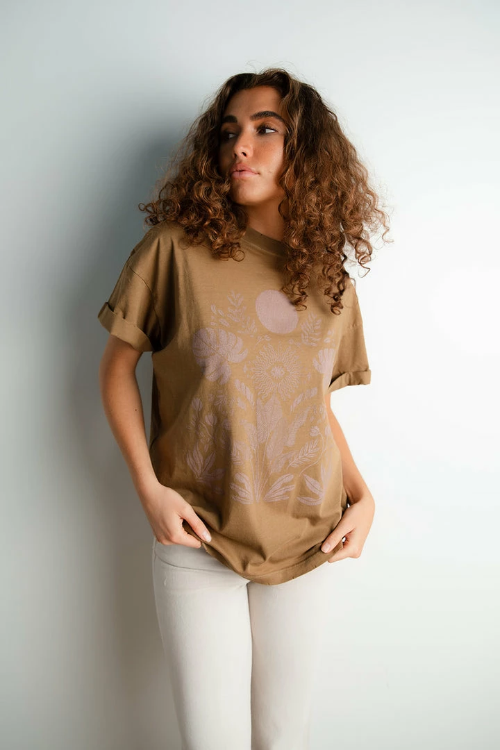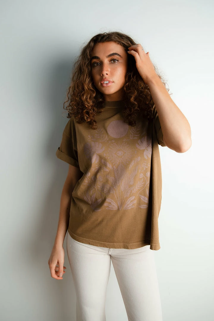 A classic crewneck with an oversized fit. This muted olive tee has a faded floral graphic with cuffed short sleeves. Definition of comfort and style.