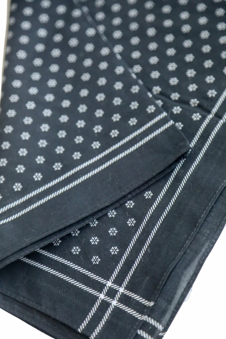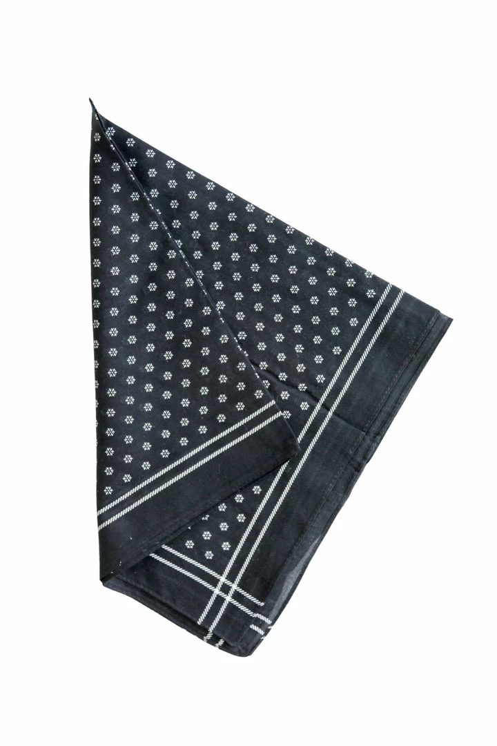 Floral dot work square scarf comes in black with white accents. We love these scarves and how versatile they are, wear them multiple ways in your hair, on your bag, or around your neck!