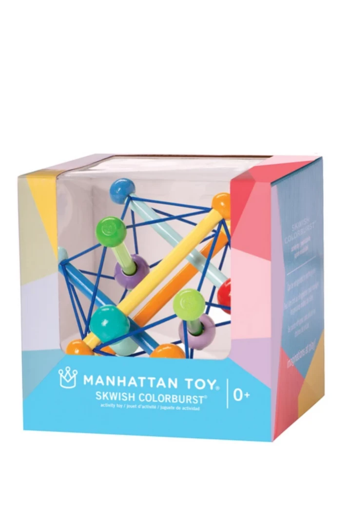 The award-winning Skwish Color Burst is a one of a kind wood rattle and teether toy with pastel colors. Made from renewable rubberwood and strung together with durable elastic cords. It Skwishes and returns to its original shape, with beads that slide and rattle. The unique design offers tactile, sensory play while doubling as a teether and rattle toy. Skwish Color Bursts easy to grasp design encourages fine and gross motor skill development while providing cognitive and visual stimulation. Striking appearance doubles as room decor, perfect for any nursery.