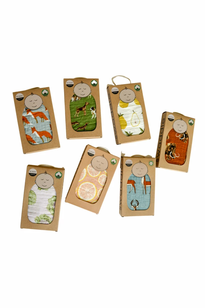 Our sumptuously soft and generously sized newborn and baby Muslin Swaddle Blanket helps our little ones feel safe and secure while being wrapped in smooth and gentle luxury. Each Swaddle Blanket measures approximately 47″ x 47″. We bundle each Bamboo Muslin Swaddle Blanket in a classic burlap sleeve adorned with a wooden button. We package each Organic Muslin Swaddle Blanket in a Kraft gift box.