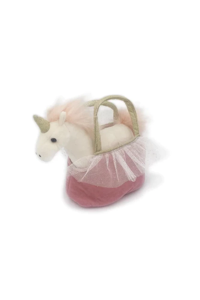 Tote around your pet bestie in their very own pretty toy purse! A pint sized Ophelia the Unicorn comes in a beautiful novel velour bag, trimmed in soft glitter tulle and gold handle.