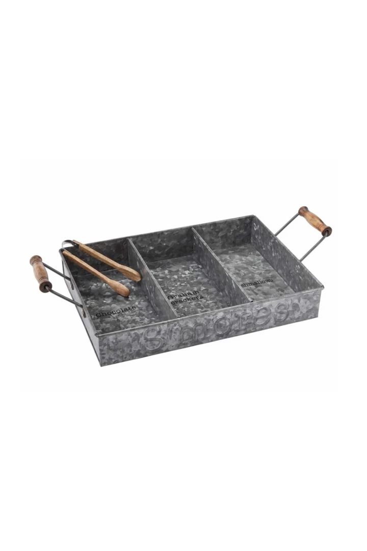 Make your s’mores eating easy and organized with this 2-piece s’more tray set. Sectioned embossed tin tray with mango wood handles and tongs.