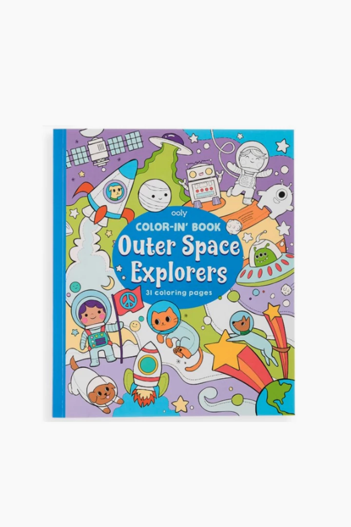Intergalactic 31 page Outer Space Explorers Coloring Book for kids with fun and futuristic designs, complete with perforated pages for easy framing and gifting.