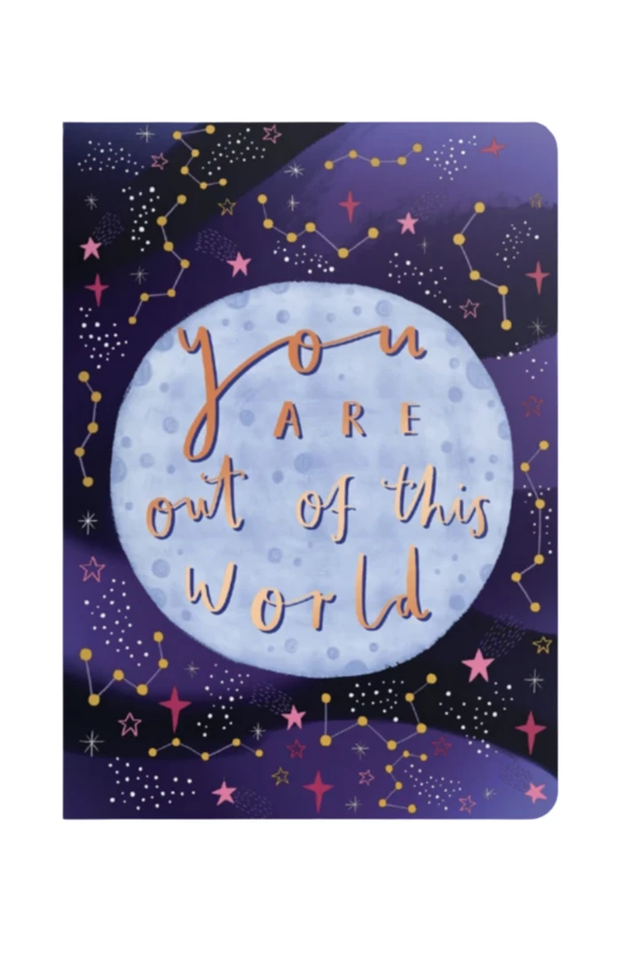 The sky is definitely not the limit with this fun space notebook. The Out of this World Jot-It! Notebook is everything you need to keep your notes, calendars and ideas in one place at your side. This 4.1 by 5.8 inch (A6 size) notebook is perfectly sized for easy travel but large enough for your out of this world ideas. With 64 pages of lined paper held together with stitched binding and a gold foiled cover, this notebook makes for a great planner, calendar and all around idea-holder.