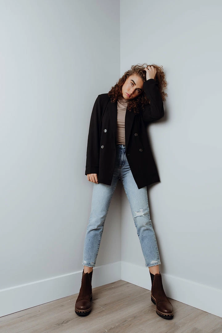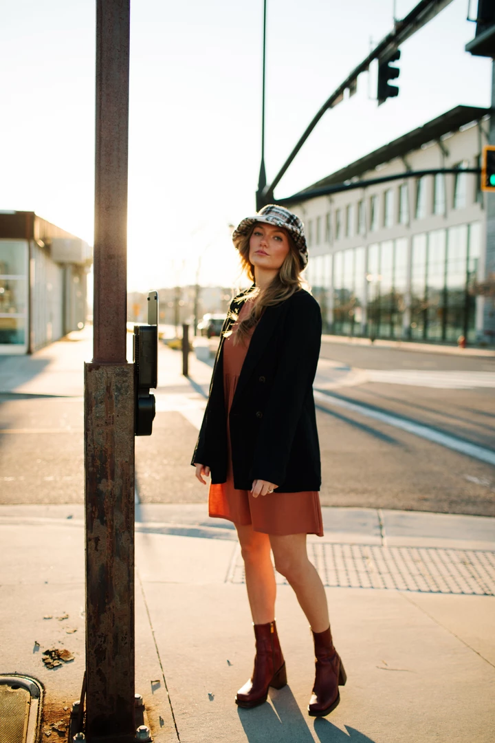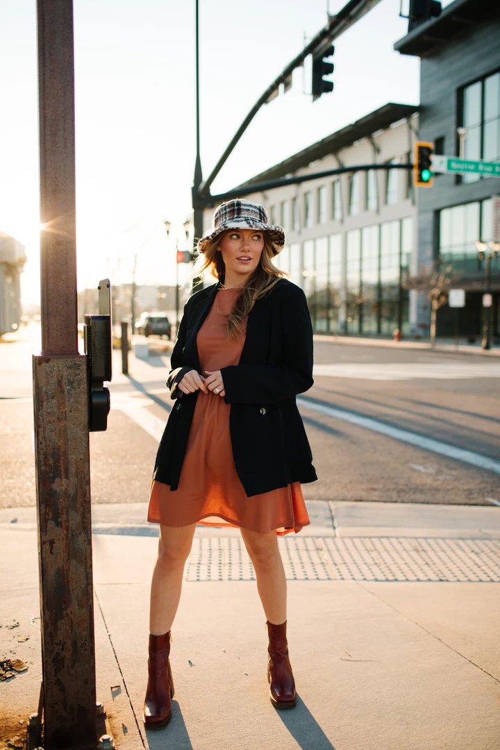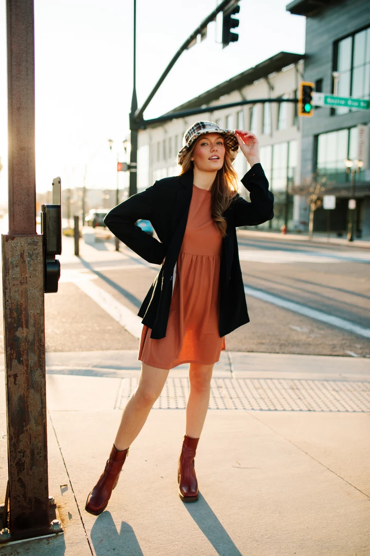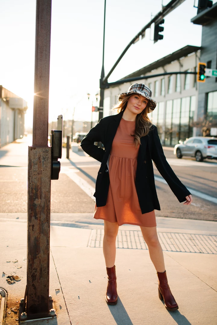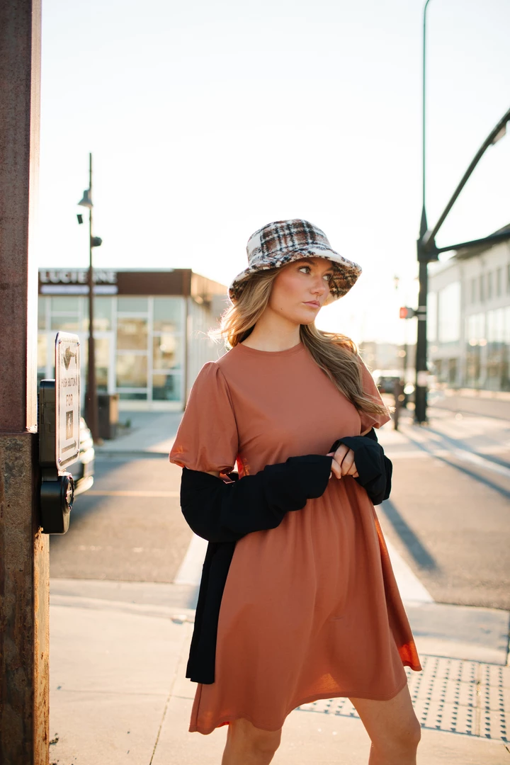 Styled w/ Lorem Babydoll Dress in Brick & Rosenthal Mock Neck
